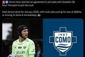 罗马诺:科莫签瑞典门将托尔奎斯特达成原则性一致